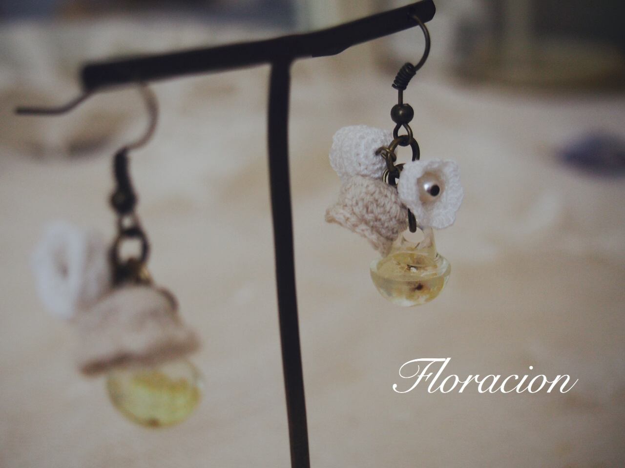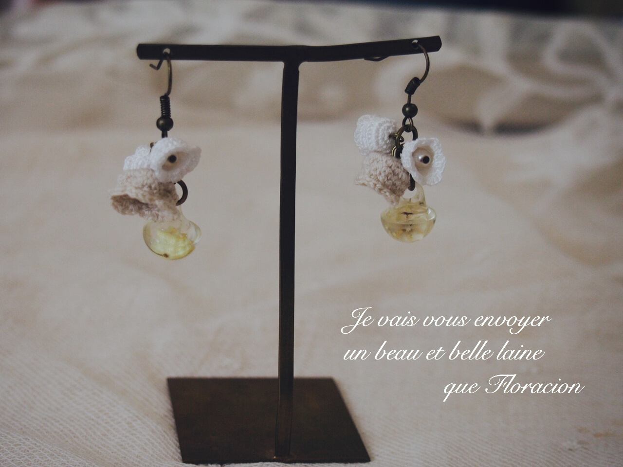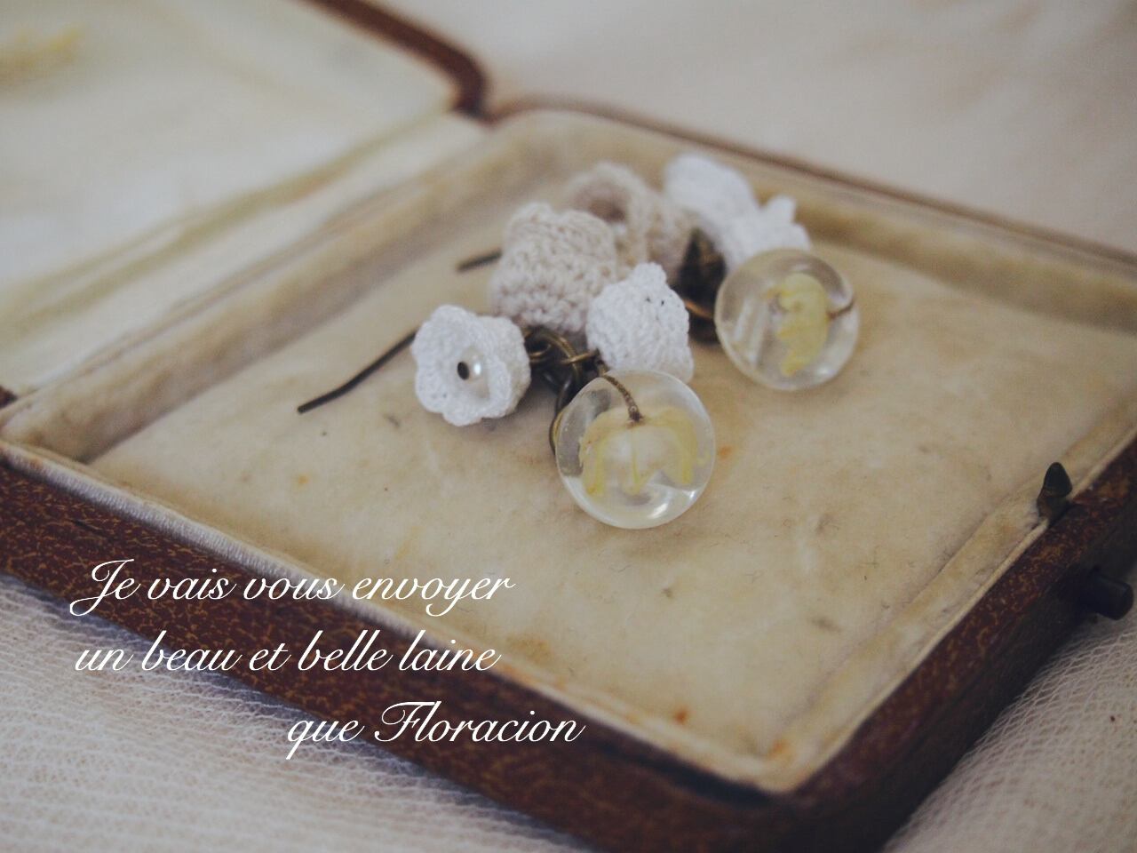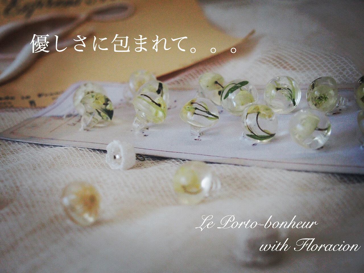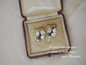 小さなレース編みスズランと、本物のスズランを樹脂で包んだ、幸せのボタンをピアスにしました。